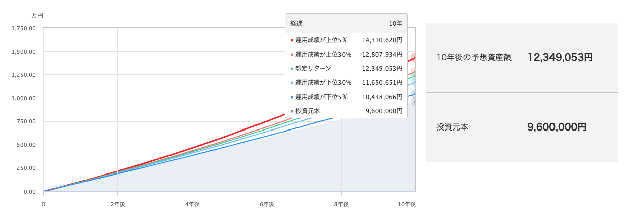 ちなみに、個人的な趣味でもある投資に関して確認すると、10年間で月8万円インデックス投資した場合はこちらです。